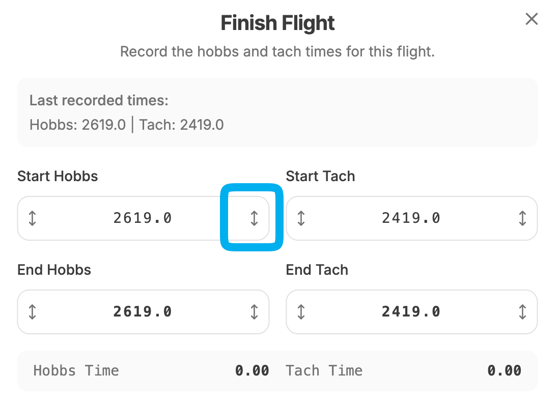 Recording flight times just got faster. The hobbs and tach fields in the Finish Flight dialog now have drag scrubbers on both sides of the input, press and drag up or down to adjust the value instead of tapping and typing. It works with a mouse on desktop and with your finger on a phone or tablet. Small tenths adjustments that used to mean fiddly keyboard work are now a quick swipe.