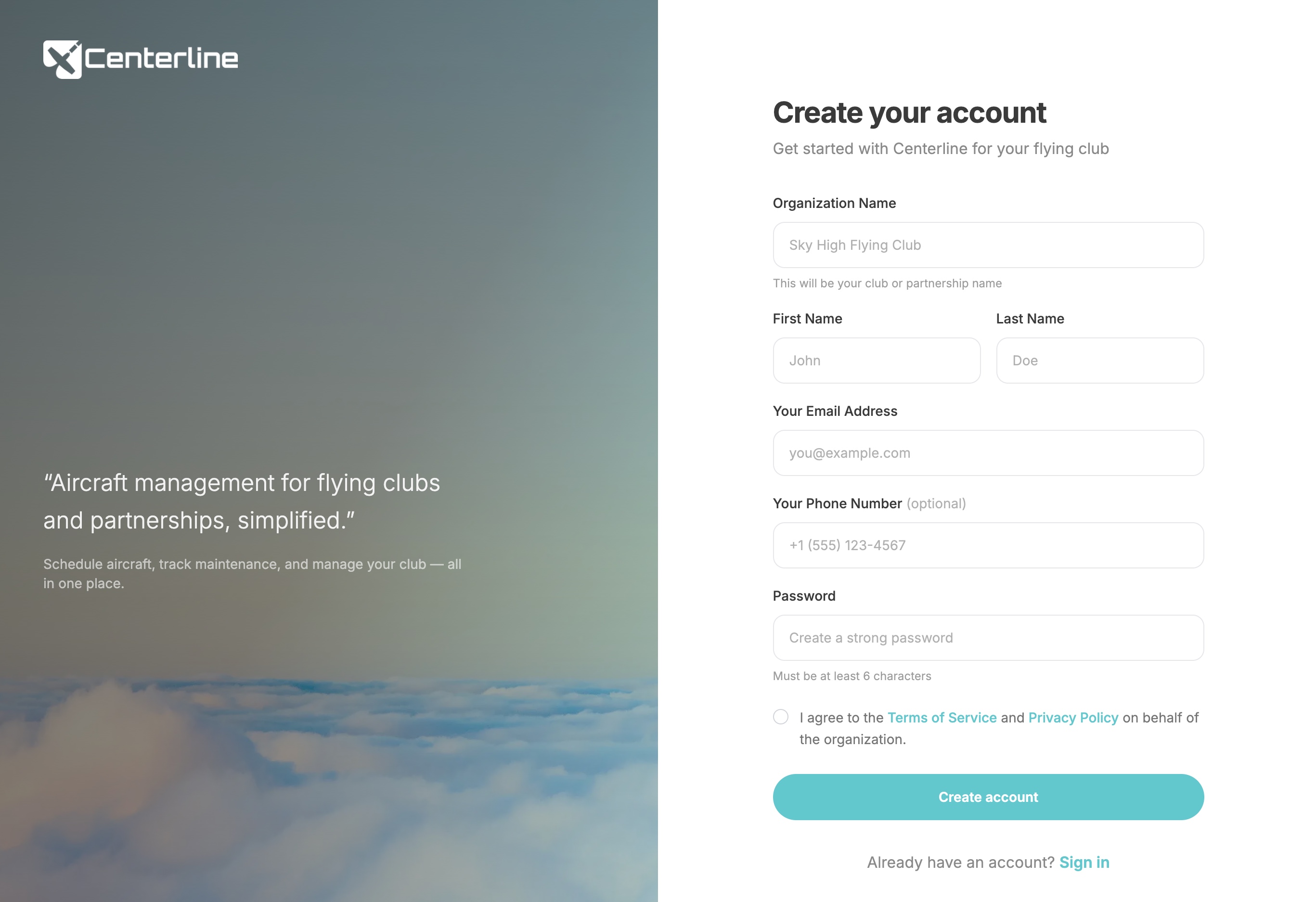 Creating a Centerline account also creates your organization (flying club or partnership). As the account creator, you'll automatically become the Account Owner with full administrative privileges.